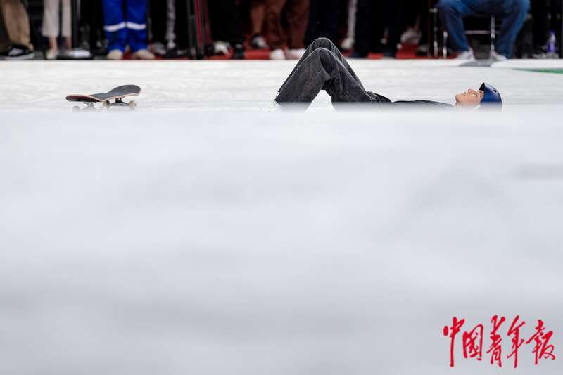 5月19日,上海,奥运资格系列赛·上海女子滑板街式决赛,澳大利亚选手C. COVELL失败后躺在地上,她最后的五组“大招”都没有取得分数,在决赛中垫底。中青报·中青网记者 李隽辉/摄