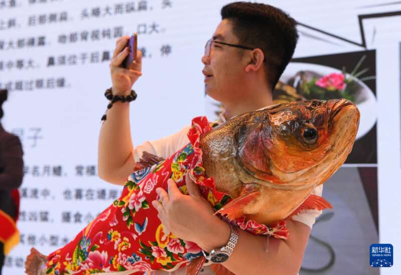 5月20日,在第八届中俄博览会上,参会人员展示从黑龙江、松花江、乌苏里江三江汇流处捕捞的胖头鱼。(图源:新华社)