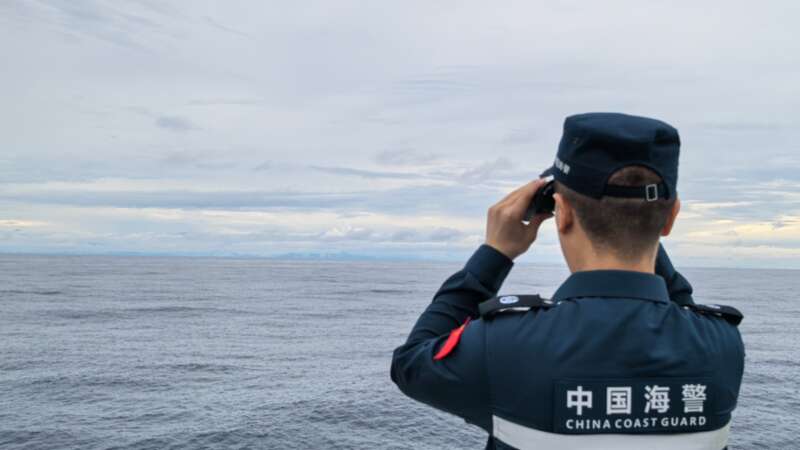 海警执法员观察瞭望台岛。