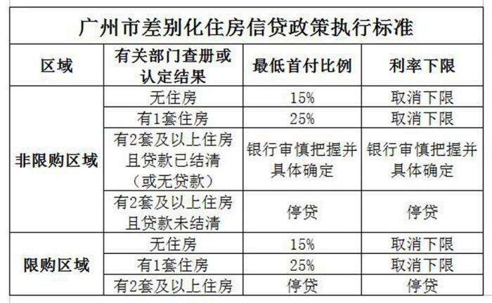 为贯彻落实党中央、国务院决策部署,适应房地产市场供求关系的新变化、人民群众对优质住房的新期待,促进广州房地产市场平稳健康发展,按照《中国人民银行 国家金融监督管理总局关于调整个人住房贷款最低首付款比例政策的通知》《中国人民银行关于调整商业性个人住房贷款利率政策的通知》等文件要求,广东市场利率定价自律机制按照因城施策原则,根据当地房地产市场形势变化及市政府调控要求,对广州市差别化住房信贷政策作以下调整: