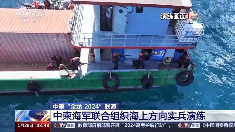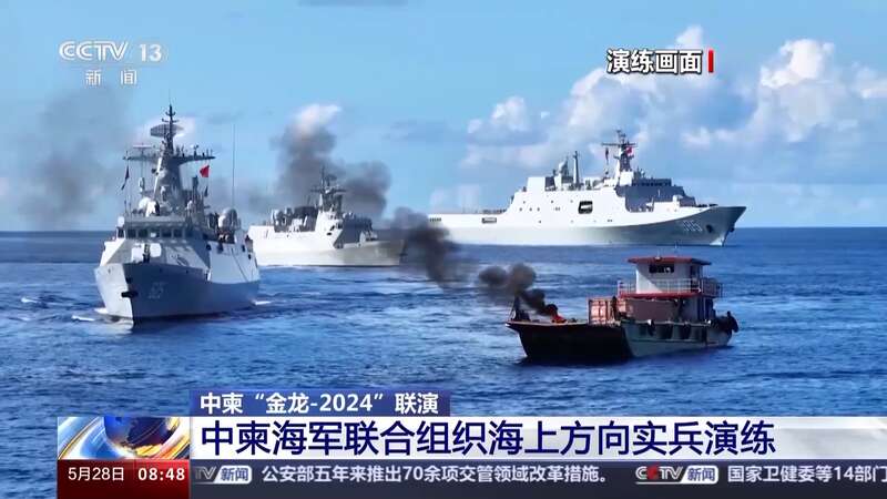 当地时间5月27日,参加中柬“金龙-2024”联演的双方海上参演兵力,在柬埔寨西哈努克港附近海域联合组织海上方向实兵演练。