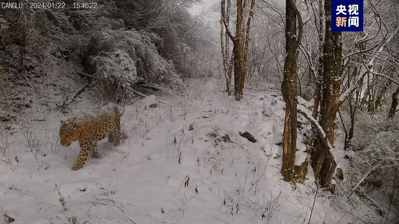1月22日的视频中,一只成年雄性金钱豹迎面从雪中走来,步伐沉稳,看上去霸气十足。突然它停了下来,前爪撑地,后爪交替刨坑,随后离开。
