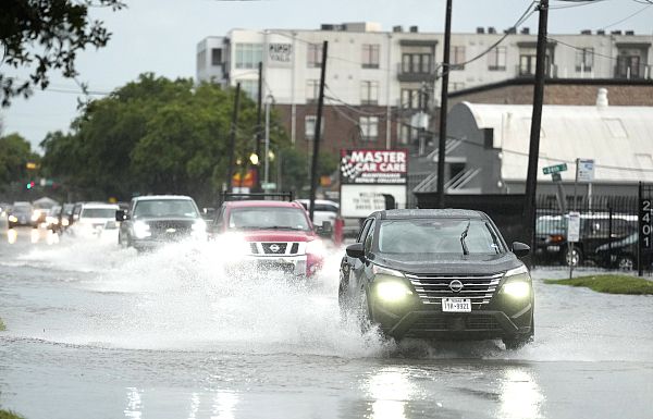 当地时间2024年5月28日,美国德克萨斯州休斯敦,一场强风暴过后,司机们在耶鲁街的高地上航行。