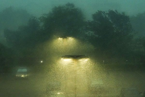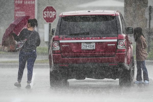 当地时间2024年5月28日,美国德克萨斯州休斯敦,一名妇女和一名女孩在一场暴雨中到达他们的汽车。