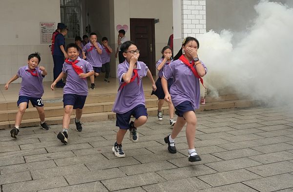2024年5月29日,广西柳州,融水苗自治县县民族小学,学生们进行消防疏散演练。