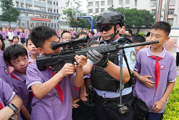 2024年5月29日,广西柳州,融水苗自治县县民族小学,一位学生在民警指导下体验枪械。