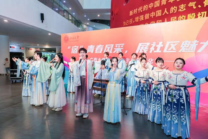 学生社区文化节开幕式上,伴着悠扬的古琴声,十几位身着汉服的同学吟诵屈原的《橘颂》,带着观众穿越到千年前的荆楚大地。广西大学供图