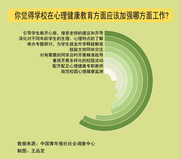 中国青年报社社会调查中心联合问卷网(wenjuan.com),近日对1000名家长进行的一项调查显示,87.0%的受访家长认为需要重视学生心理健康问题,58.9%的受访家长期待学校引导学生敞开心扉,接受老师的建议和开导,58.6%的受访家长期待学校深化对不同年龄学生的生理、心理特点的了解。
