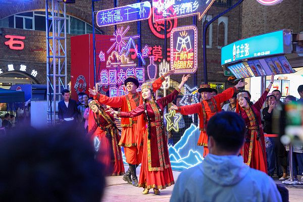2024年5月30日,在新疆国际大巴扎景区,演员为游客表演舞蹈。新疆乌鲁木齐国际大巴扎景区游人如织。游客纷纷来到新疆国际大巴扎景区的游玩、乐购,乐享夏日好时光。