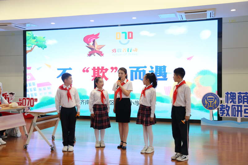 在济南市“070勇敢者行动”推进会现场,槐荫区的辅导员老师和队员们通过红领巾辩论赛、少先队活动课、红领巾小剧场、红领巾模拟法庭等形式,深化防校园欺凌教育。