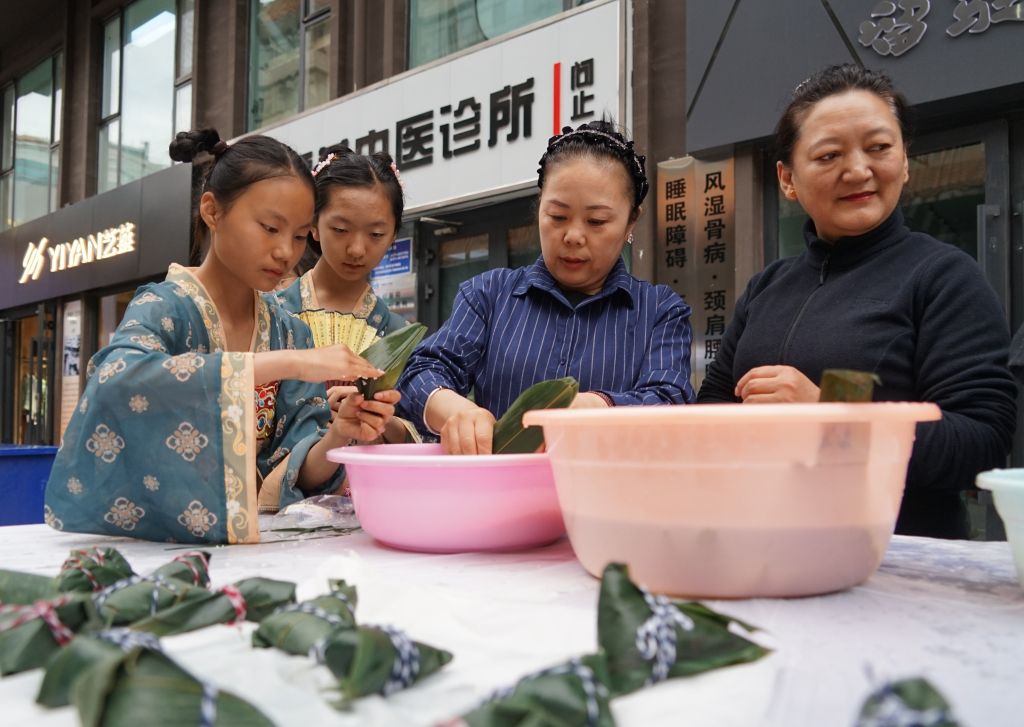2024年5月31日晚间,西宁,市民在活动现场体验包粽子。当日晚间,“我们的节日——游老街赏非遗,过端午品民俗”主题活动在西宁市城中区大新街举行。大新街夜市已运行20余年,是西宁市代表性夜市之一。 中新社记者 马铭言 摄