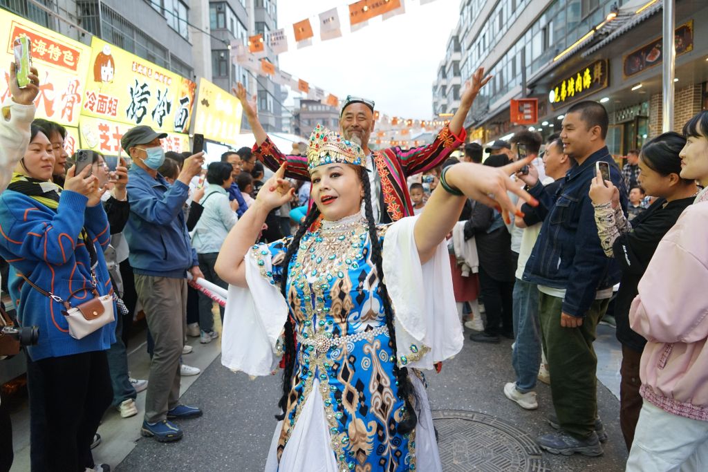 2024年5月31日,西宁市大新街夜市歌舞表演。当晚,“我们的节日——游老街赏非遗,过端午品民俗”主题活动在西宁市城中区大新街举行。大新街夜市已运行20余年,是西宁市代表性夜市之一。 中新社记者 马铭言 摄