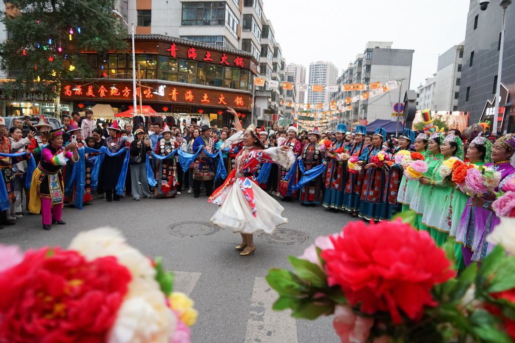 2024年5月31日晚间,演员在西宁市大新街夜市口尽情舞蹈。当日晚间,“我们的节日——游老街赏非遗,过端午品民俗”主题活动在西宁市城中区大新街举行。大新街夜市已运行20余年,是西宁市代表性夜市之一。 中新社记者 马铭言 摄
