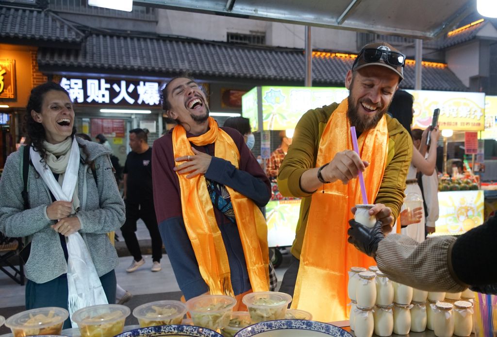 5月31日晚间,外国游客在西宁市大新街夜市品尝青海特色酸奶。当日晚间,“我们的节日——游老街赏非遗,过端午品民俗”主题活动在西宁市城中区大新街举行。大新街夜市已运行20余年,是西宁市代表性夜市之一。 中新社记者 马铭言 摄