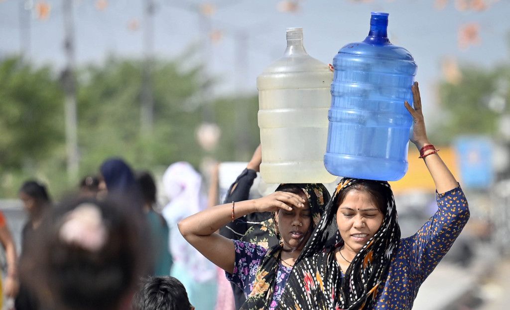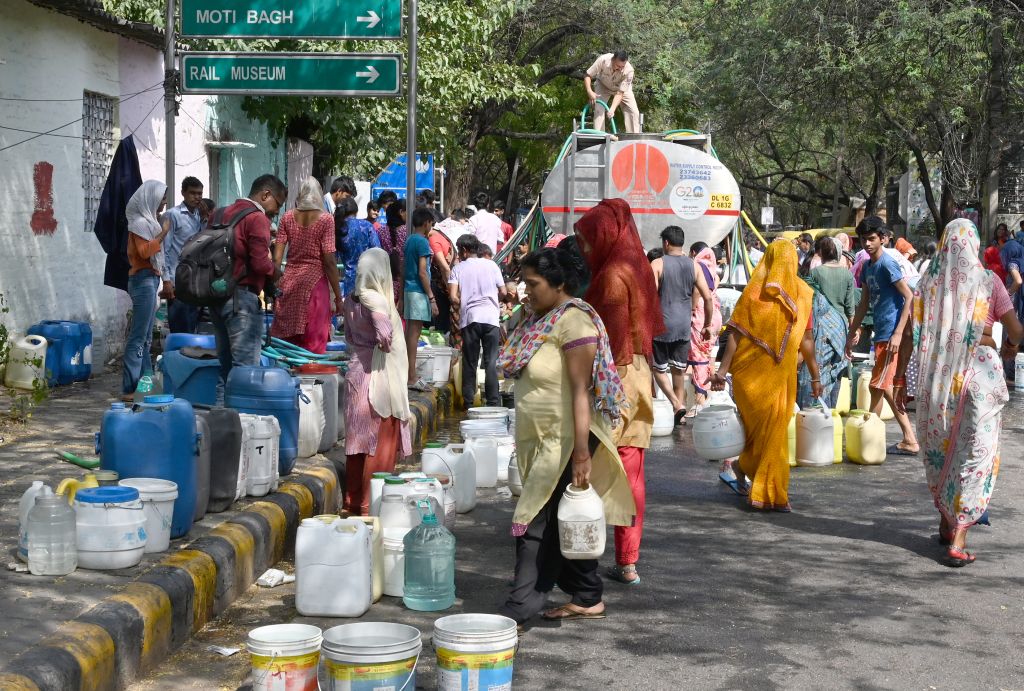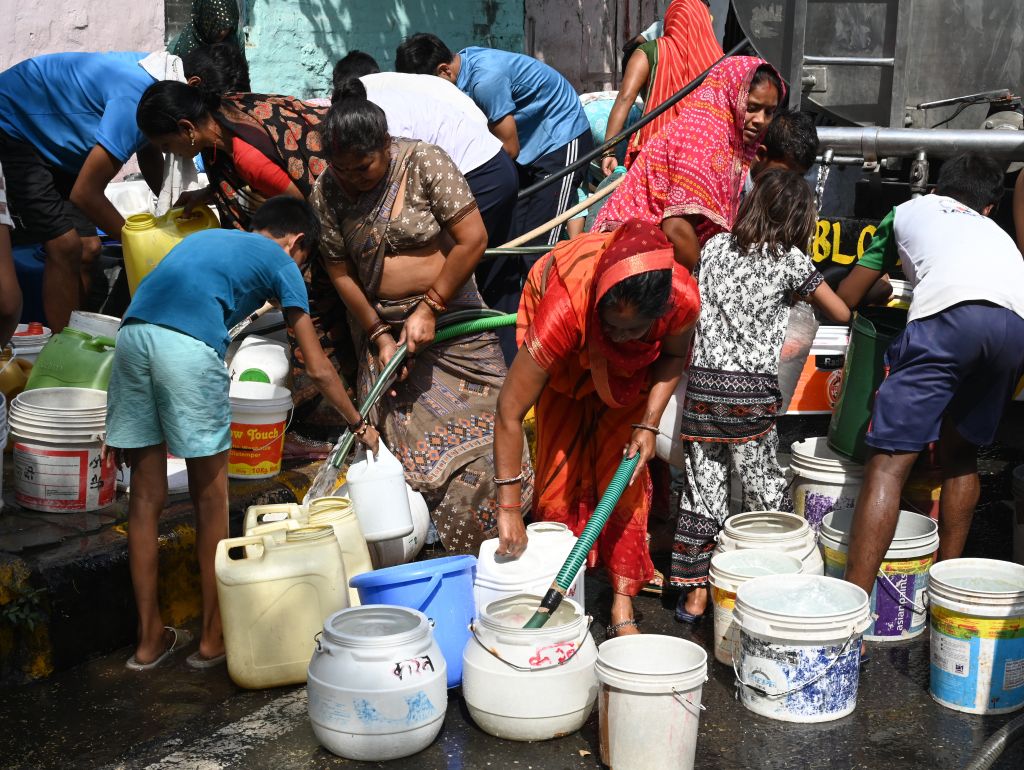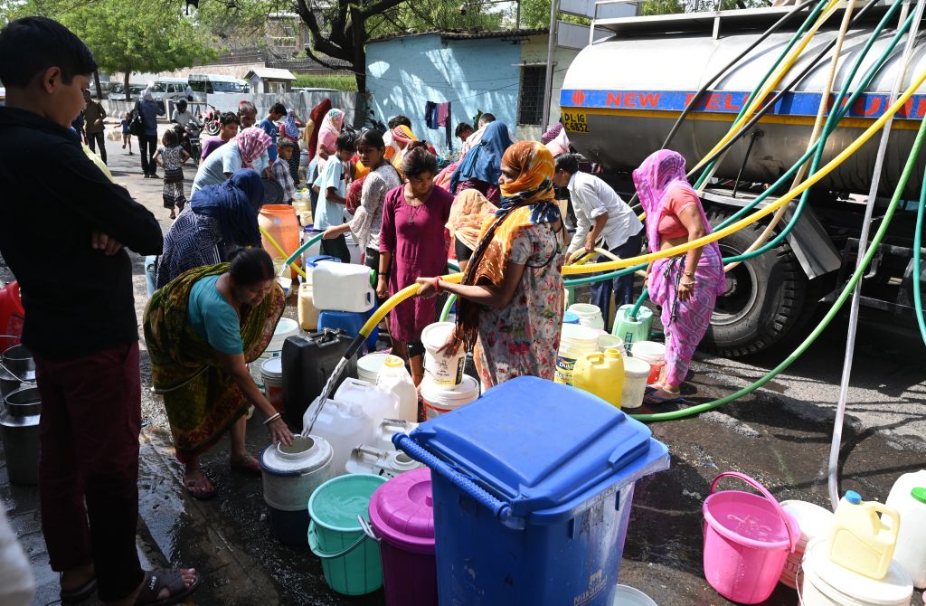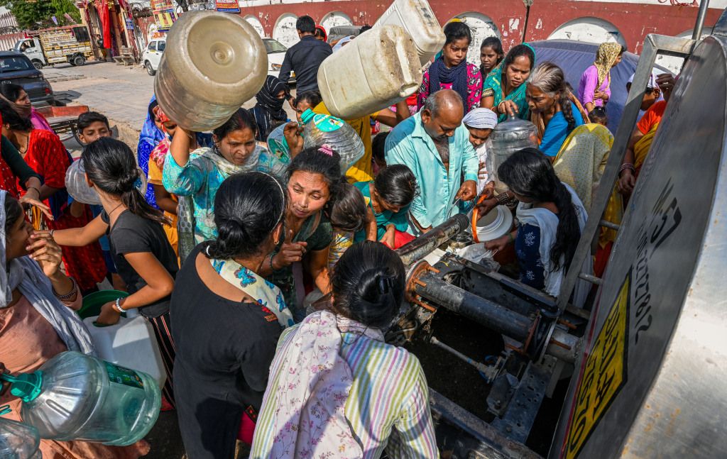 当地时间2024年5月31日,印度新德里,居民和儿童从德里水务局的一辆水罐车上取水,以应对夏季的水危机。德里多个地区面临严重缺水问题。在烈日炎炎下,人们排着长队等待,希望至少能装满一桶水。