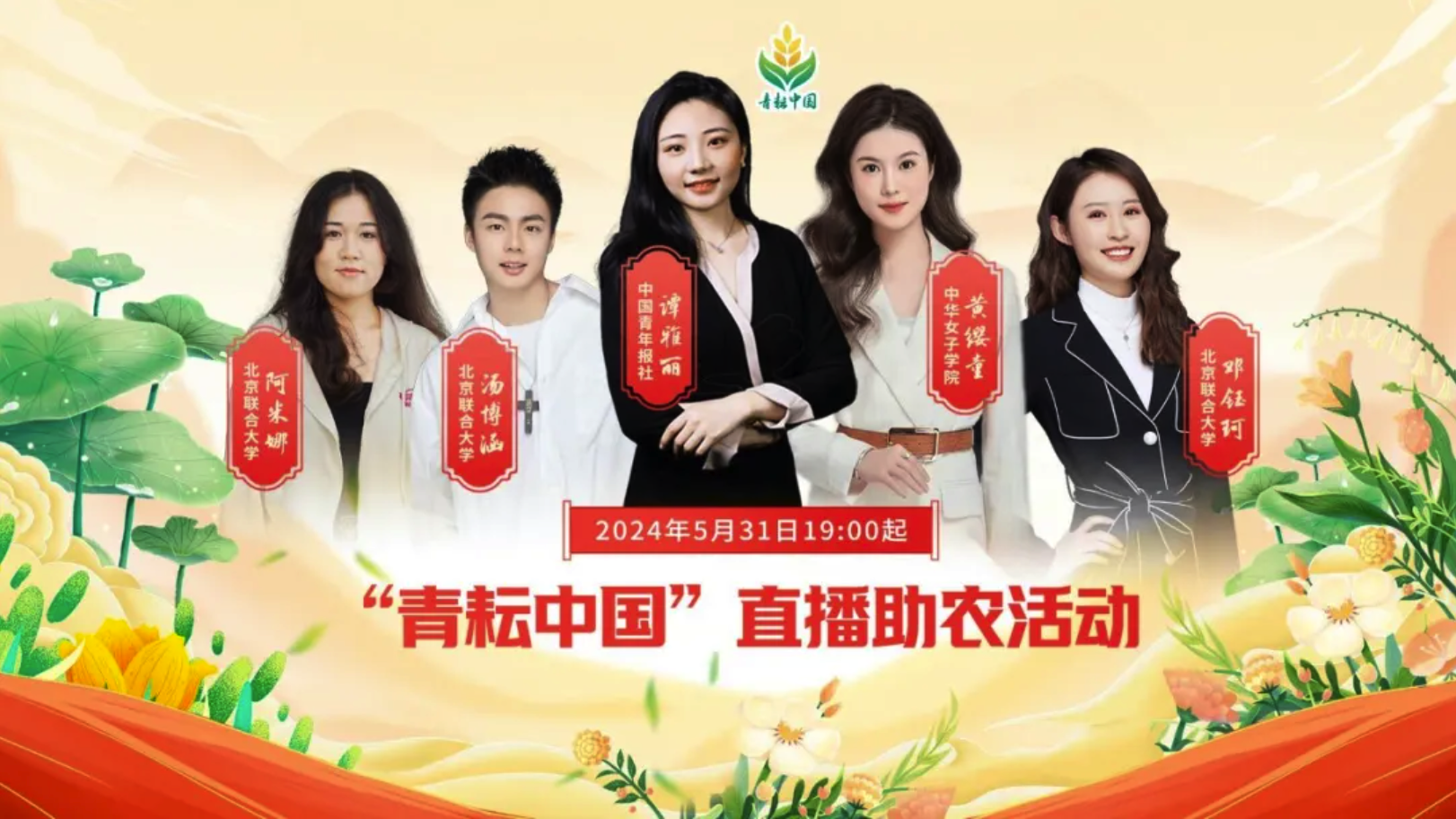 5月31日(今天),中国青年报社谭雅丽,中华女子学院黄缨童,北京联合大学邓钰珂、汤博涵、阿米娜 进行“青耘中国”直播助农活动。同时,北京联合大学薛清心、田诺奇、陈荣强、杜一诺在直播期间进行京剧、二胡、古琴、相声、绘画等才艺展示。