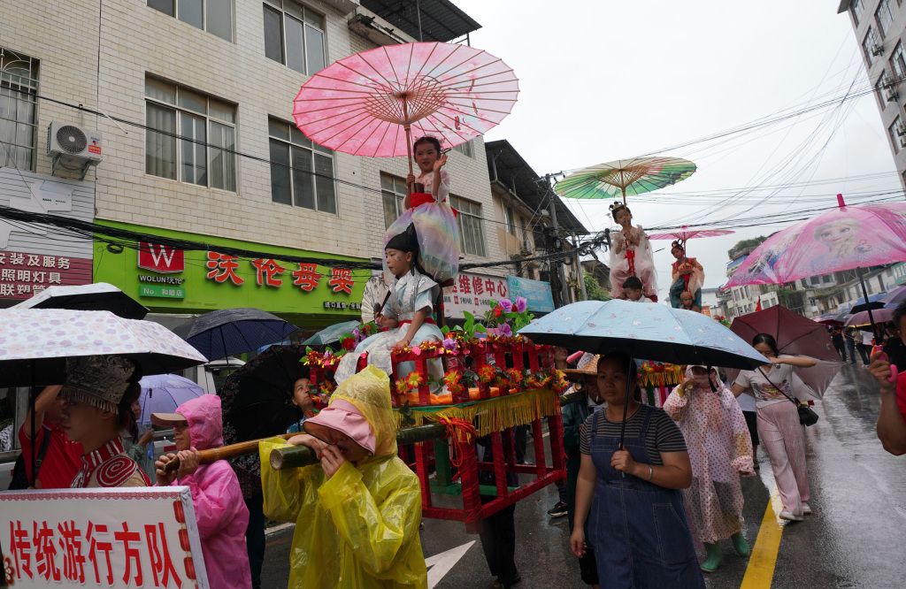 2024年5月31日,广西柳州,融水苗族自治县和睦镇,汉族市民正在抬故事。