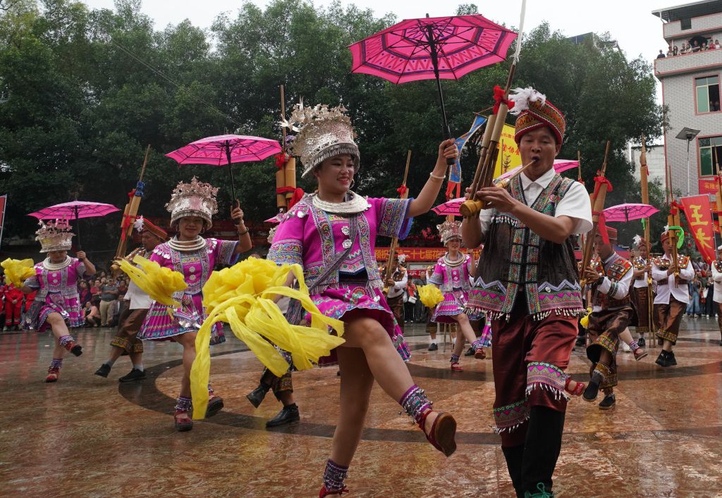 2024年5月31日,广西柳州,融水苗族自治县和睦镇,市民和游人在吹芦笙踩堂。
