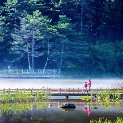 清晨,就有成群结队的游客在长白山脚下的小径上漫步,五彩缤纷的野花散发出淡淡的清香,再加上山谷里传出的鸟鸣,着实令人沉醉。云雾笼罩中,远处的山峰若隐若现,神秘又梦幻。