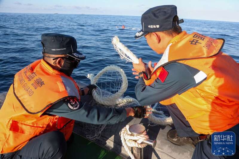↑5月15日,中国海警局赤瓜舰执法员在仁爱礁及其附近海域查看被菲方人员破坏的渔网。新华社记者 赵晨捷 摄