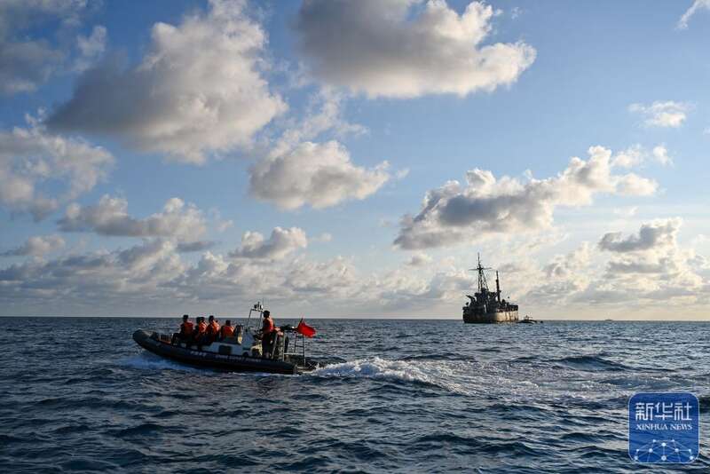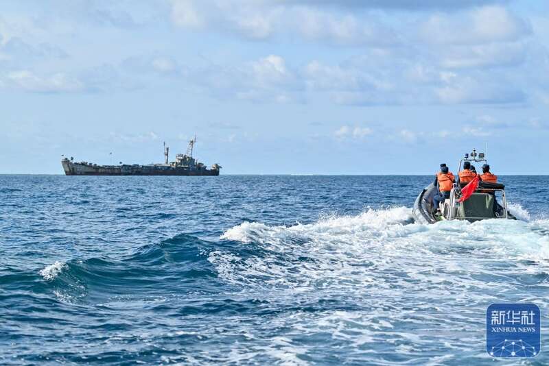 ↑5月16日,中国海警局赤瓜舰执法员在菲律宾非法“坐滩”军舰附近巡查。新华社发(石磊摄)