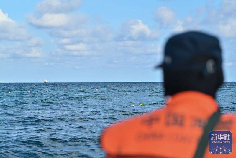 ↑5月16日,中国海警局赤瓜舰执法员在菲律宾非法“坐滩”军舰附近巡查。新华社记者 李鑫 摄