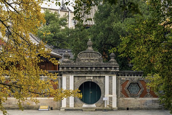 夏日的万寿寺,一砖一瓦在阳光下露出时光抚摸过的痕迹。腾飞的金龙、山海经里的神兽、纷飞的旋花……在一处院子的屋檐上,点缀着金边的彩画若隐若现。走近细看,金边已在年复一年的风吹日晒中褪色,彩画的色彩也不再夺目。
