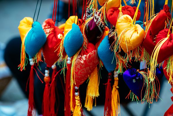 2024年6月6日,陕西省渭南市临渭区,端午节艾草和香包上市了。图为香包。
