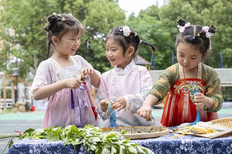 2024年6月6日,在合肥市庐阳区林店街道荣城幼教集团总园,孩子们正在做香囊、挂香囊。 端午佳节临近,林店街道团工委联合辖区幼儿园开展“DIY巧手做香囊”端午民俗活动,并为孩子们讲解端午传统习俗,传承中华传统文化。