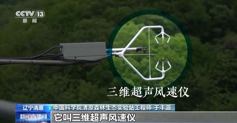 中国科学院清原森林生态实验站工程师 于丰源:它叫闭路涡动通量相关测量系统,最外面有像三个小爪爪,它叫三维超声风速仪,可以实时地监测风速和风向的变化。