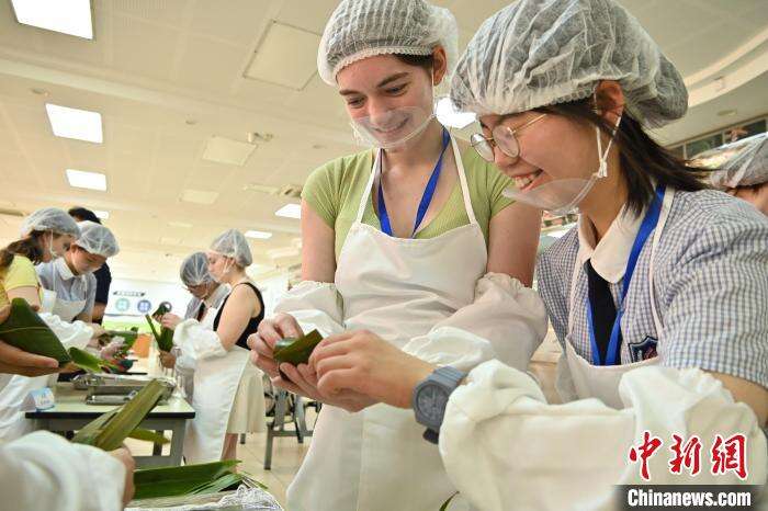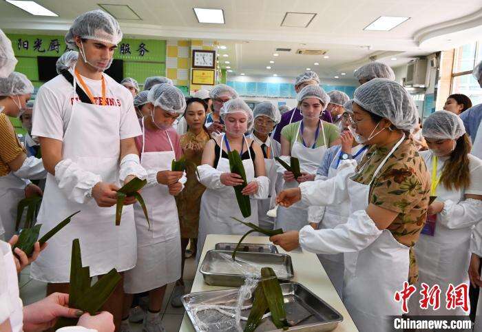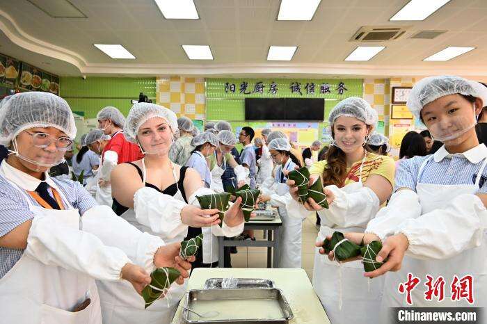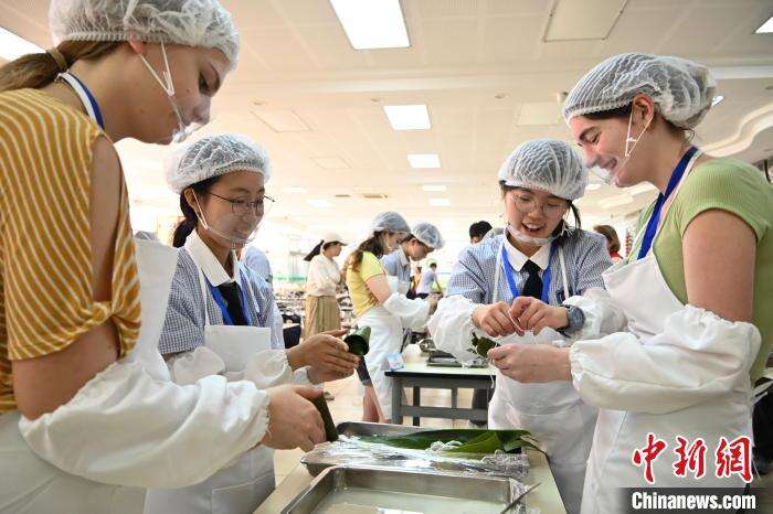 6月8日,河北省石家庄外国语学校,中美学生正在包粽子。在端午节来临之际,美国艾奥瓦州中学生“友谊传承”研学团师生51人在该校参加体验中国端午节相关活动,大家一同包粽子、做香包……感受中国传统文化。翟羽佳 摄