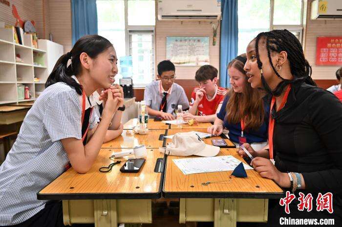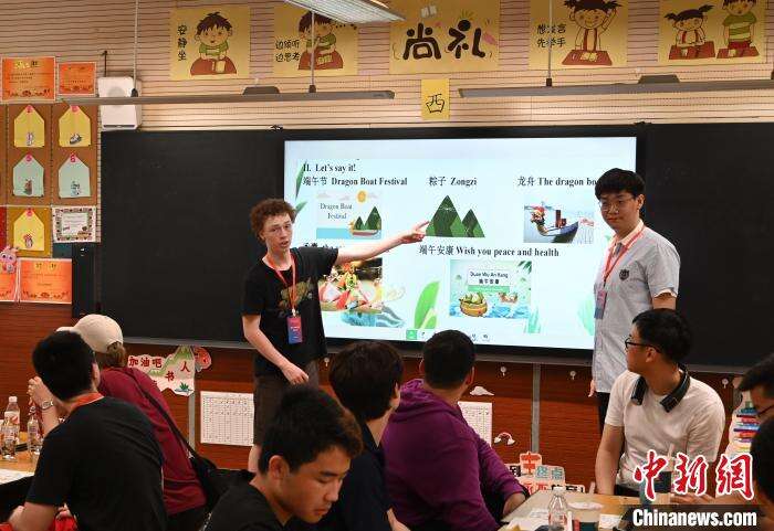 6月8日,河北省石家庄外国语学校,中美学生同上了一节有关端午节的文化课。在端午节来临之际,美国艾奥瓦州中学生“友谊传承”研学团师生51人在该校参加体验中国端午节相关活动,大家一同包粽子、做香包……感受中国传统文化。翟羽佳 摄