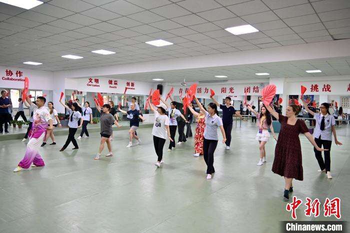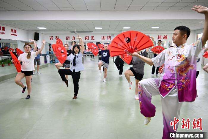 6月8日,河北省石家庄外国语学校,中美学生体验太极扇。在端午节来临之际,美国艾奥瓦州中学生“友谊传承”研学团师生51人在该校参加体验中国端午节相关活动,大家一同包粽子、做香包……感受中国传统文化。翟羽佳 摄