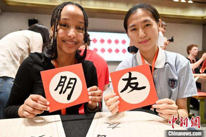 6月8日,河北省石家庄外国语学校,美国中学生体验写汉字后,与该校学生互换留念。在端午节来临之际,美国艾奥瓦州中学生“友谊传承”研学团师生51人在该校参加体验中国端午节相关活动,大家一同包粽子、做香包……感受中国传统文化。翟羽佳 摄