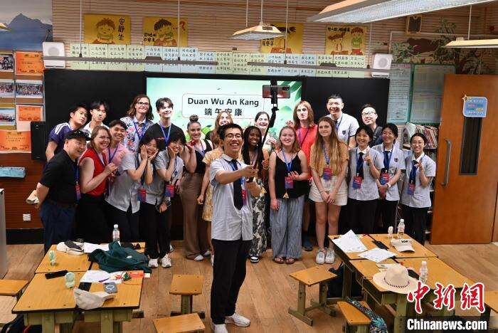 6月8日,河北省石家庄外国语学校,中美学生同上了一节有关端午节的文化课,课程结束后部分学生自拍留念。在端午节来临之际,美国艾奥瓦州中学生“友谊传承”研学团师生51人在该校参加体验中国端午节相关活动,大家一同包粽子、做香包……感受中国传统文化。翟羽佳 摄