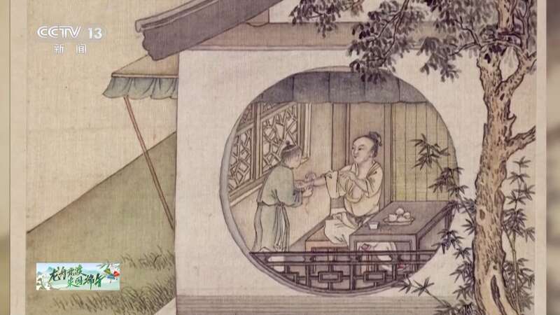 《端阳故事图》里的《系采丝》,图上提字:“系采丝,以五色丝系臂,谓之长命缕。”端午节时,在手臂、手腕,或悬在儿童胸前系上五彩丝线或绒线,用来消灾祈福的。图上年少的给年长者系五彩丝,展现了天伦之情。现在我们端午节也有系五色丝的习俗。