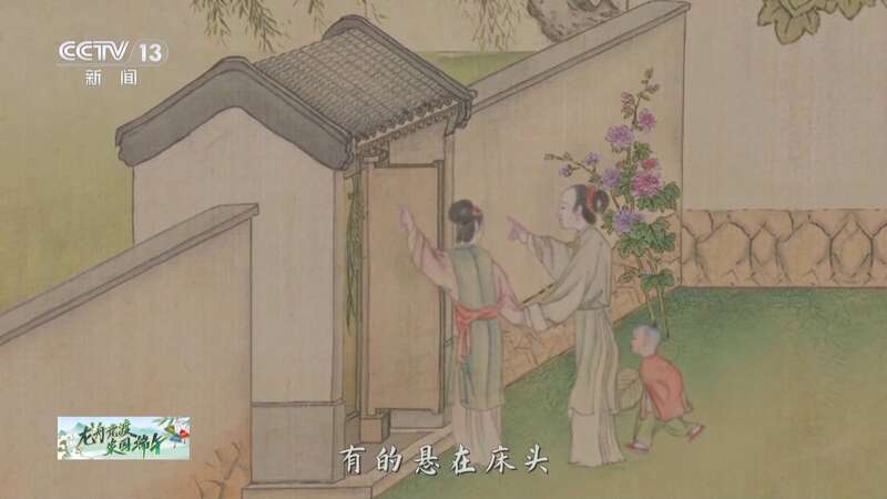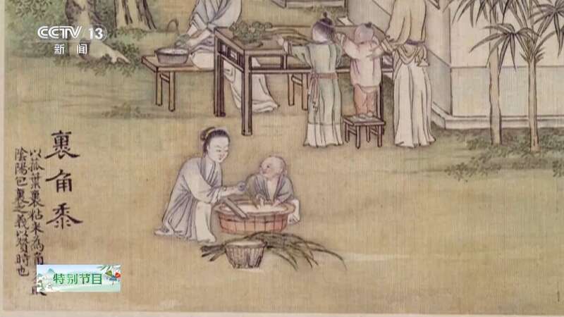 清代画家徐扬所作的《端阳故事图》就记录了系采丝、射粉团、悬艾、裹角黍等清代端午节的习俗。《端阳故事图》共八开,构图严谨精妙,人物造型秀逸生动,色彩明丽典雅,显示出乾隆朝宫廷绘画工整清丽的笔墨特点。