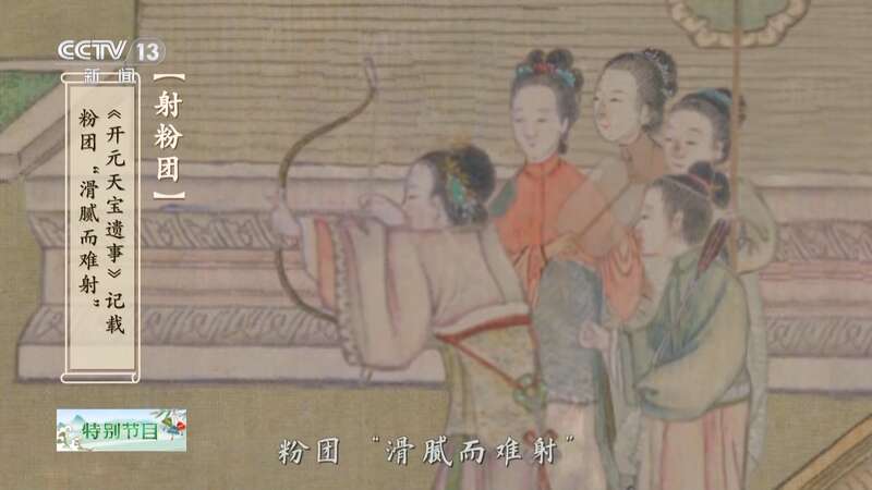 射粉团是一种起源于唐代宫廷的游戏。每到端午节,人们将黄米角黍或玉米团子切成小块,放在盘中,并瞄准它射箭,射中粉团的人才可以享用。《开元天宝遗事》记载,粉团“滑腻而难射”,看来只有拥有“快准狠”的箭法,才有机会一饱口福。