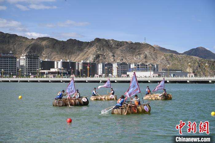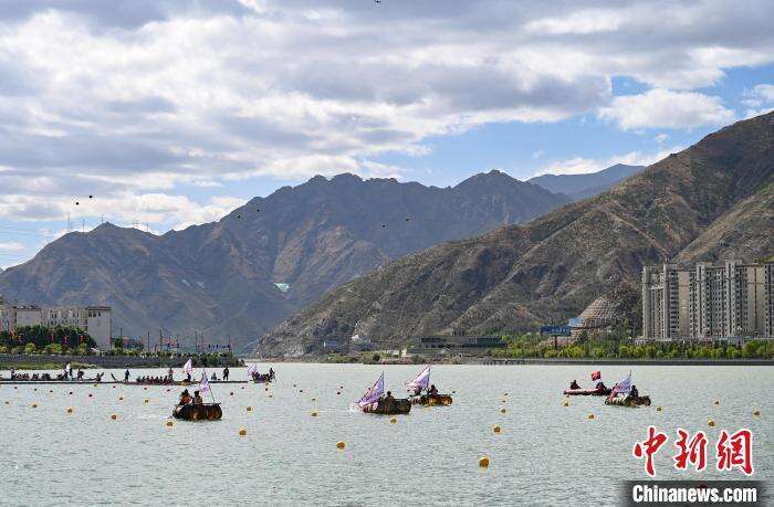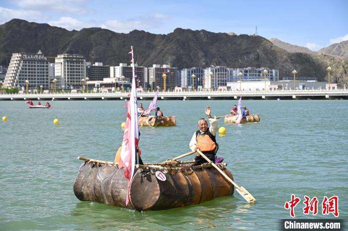 6月9日,2024年西藏自治区端午节牛皮船(龙舟)赛在拉萨市滨河公园水域举办。据悉,本次赛事系西藏首次举办、也是中国国内海拔最高的牛皮船(龙舟)赛 。比赛邀请了来自辽宁、湖北、湖南、四川、云南、贵州和广西壮族自治区的30名龙舟运动员,与西藏区内的30名龙舟运动员以及40名牛皮船运动员进行同场竞技。图为牛皮船比赛现场。贡嘎来松 摄