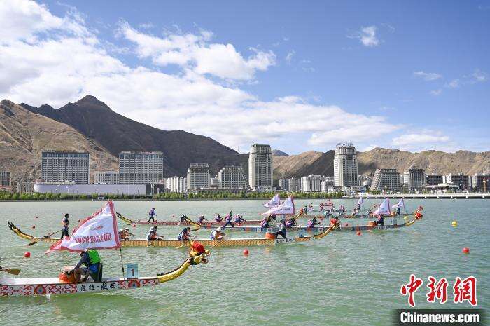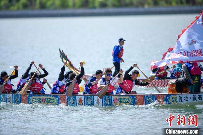 6月9日,2024年西藏自治区端午节牛皮船(龙舟)赛在拉萨市滨河公园水域举办。据悉,本次赛事系西藏首次举办、也是中国国内海拔最高的牛皮船(龙舟)赛 。比赛邀请了来自辽宁、湖北、湖南、四川、云南、贵州和广西壮族自治区的30名龙舟运动员,与西藏区内的30名龙舟运动员以及40名牛皮船运动员进行同场竞技。图为龙舟比赛现场。贡嘎来松 摄