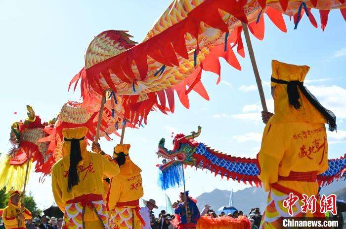 6月9日,2024年西藏自治区端午节牛皮船(龙舟)赛在拉萨市滨河公园水域举办。据悉,本次赛事系西藏首次举办、也是中国国内海拔最高的牛皮船(龙舟)赛 。比赛邀请了来自辽宁、湖北、湖南、四川、云南、贵州和广西壮族自治区的30名龙舟运动员,与西藏区内的30名龙舟运动员以及40名牛皮船运动员进行同场竞技。图为“舞龙表演”现场。贡嘎来松 摄
