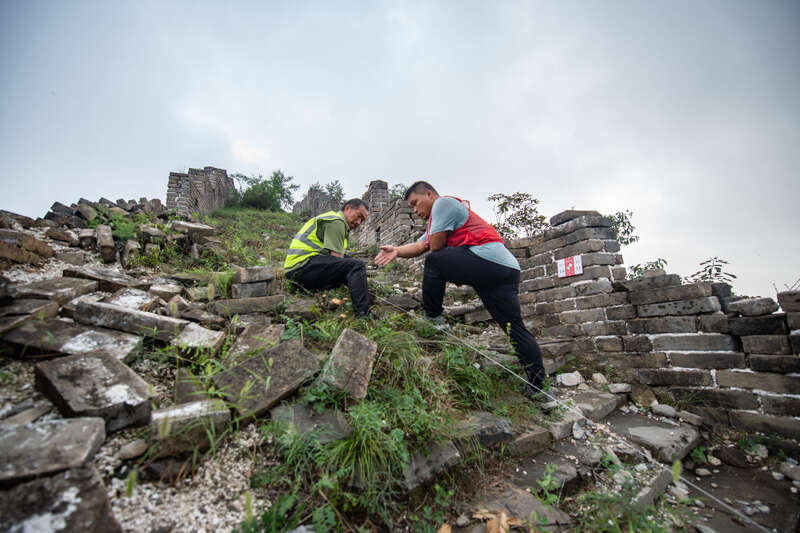 技工杨战杰(右)在指导工人拉线划设北京箭扣长城研究性修缮考古发掘范围(2022年8月17日摄)。新华社记者 陈钟昊 摄