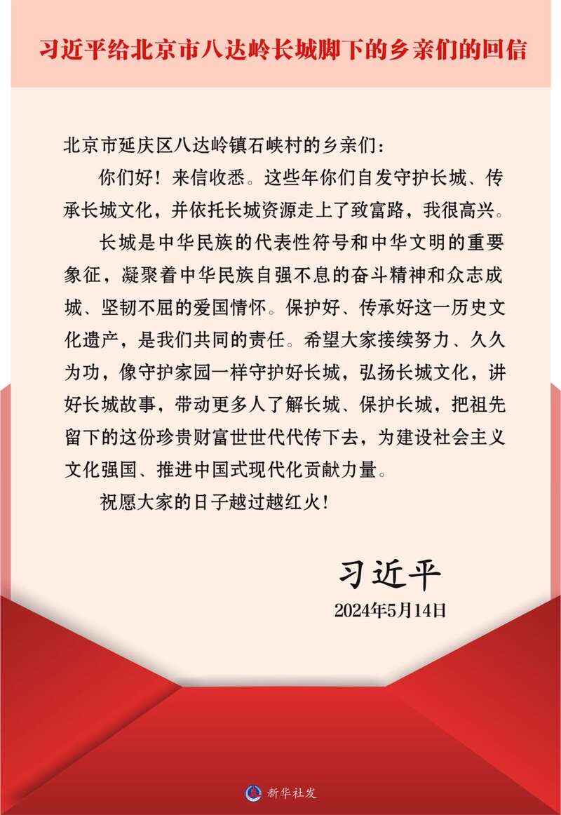 “长城是中华民族的代表性符号和中华文明的重要象征,凝聚着中华民族自强不息的奋斗精神和众志成城、坚韧不屈的爱国情怀。” 5月14日,习近平总书记给北京市延庆区八达岭镇石峡村的乡亲们回信,深刻阐释了长城的独特价值和守护好长城的重大意义,勉励大家“把祖先留下的这份珍贵财富世世代代传下去”。