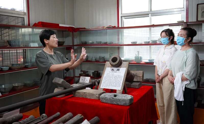 在秦皇岛市海港区的长城文化展馆,长城保护员李翠(左一)向游客介绍长城文化知识(2021年7月8日摄)。新华社记者 金皓原 摄