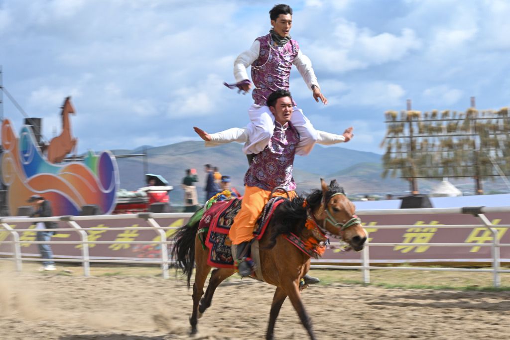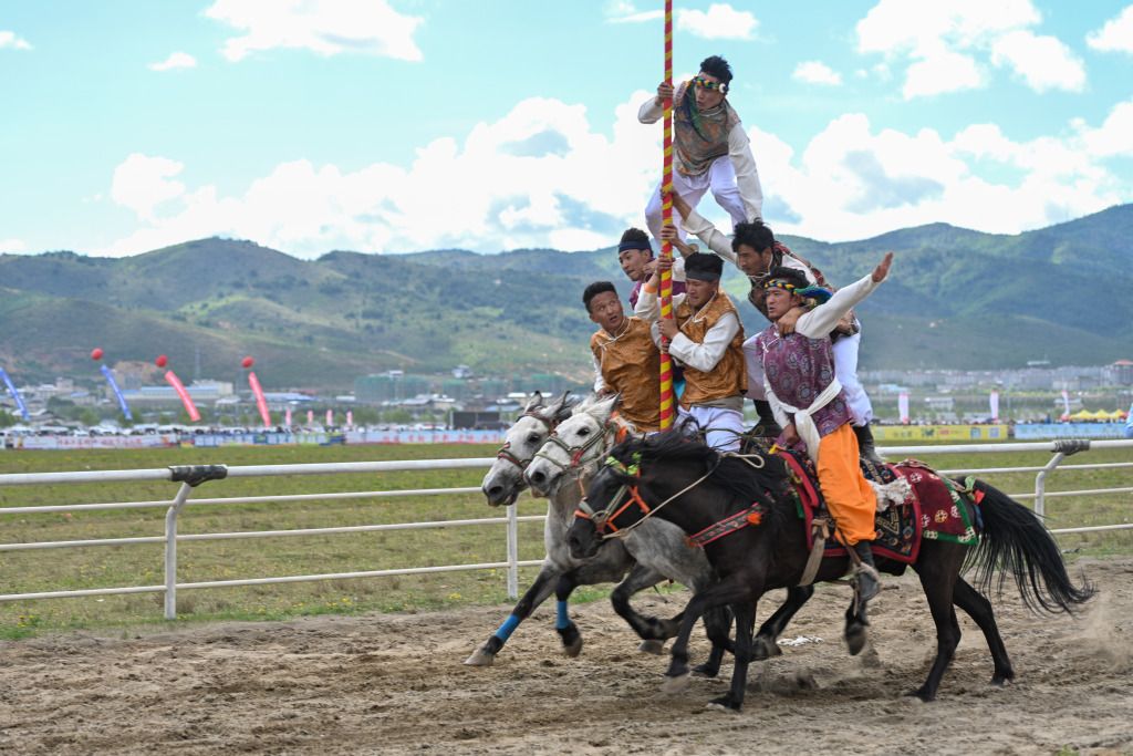 2024年6月10日,参赛选手在开幕式上进行马术表演。当日,“龙马奔腾 奋蹄逐梦”2024年迪庆·香格里拉赛马会在云南省迪庆藏族自治州香格里拉市开幕,本届赛马会共有294匹马匹参赛,竞赛项目分别为甲、乙、丙的1000米、3000米、5000米竞速赛、马技赛以及射弩、射箭等20个比赛项目。 中新社记者 李嘉娴 摄