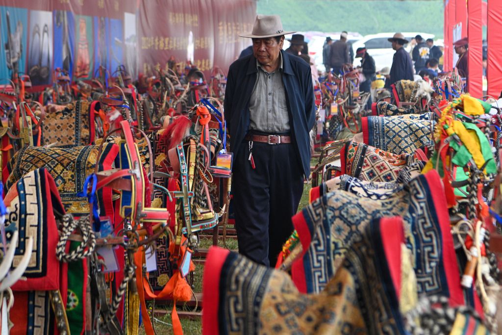 2024年6月10日,市民参观民间鞍马具展评。当日,“龙马奔腾 奋蹄逐梦”2024年迪庆·香格里拉赛马会在云南省迪庆藏族自治州香格里拉市开幕,本届赛马会共有294匹马匹参赛,竞赛项目分别为甲、乙、丙的1000米、3000米、5000米竞速赛、马技赛以及射弩、射箭等20个比赛项目。 中新社记者 李嘉娴 摄