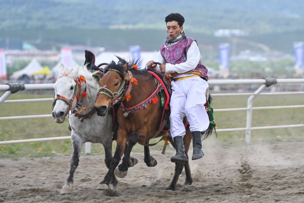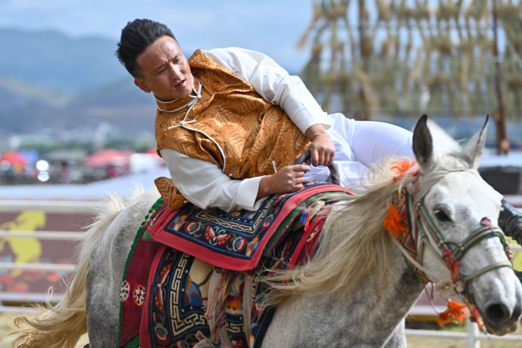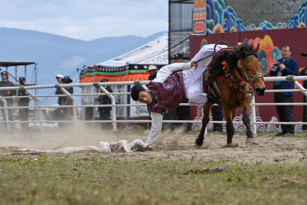 2024年6月10日,参赛选手在开幕式上表演跑马拾哈达。当日,“龙马奔腾 奋蹄逐梦”2024年迪庆·香格里拉赛马会在云南省迪庆藏族自治州香格里拉市开幕,本届赛马会共有294匹马匹参赛,竞赛项目分别为甲、乙、丙的1000米、3000米、5000米竞速赛、马技赛以及射弩、射箭等20个比赛项目。 中新社记者 李嘉娴 摄