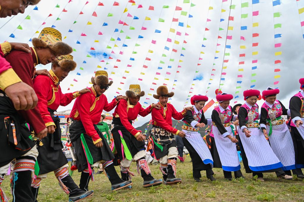2024年6月10日,民众起舞欢庆赛马会开幕。当日,“龙马奔腾 奋蹄逐梦”2024年迪庆·香格里拉赛马会在云南省迪庆藏族自治州香格里拉市开幕,本届赛马会共有294匹马匹参赛,竞赛项目分别为甲、乙、丙的1000米、3000米、5000米竞速赛、马技赛以及射弩、射箭等20个比赛项目。 中新社记者 李嘉娴 摄