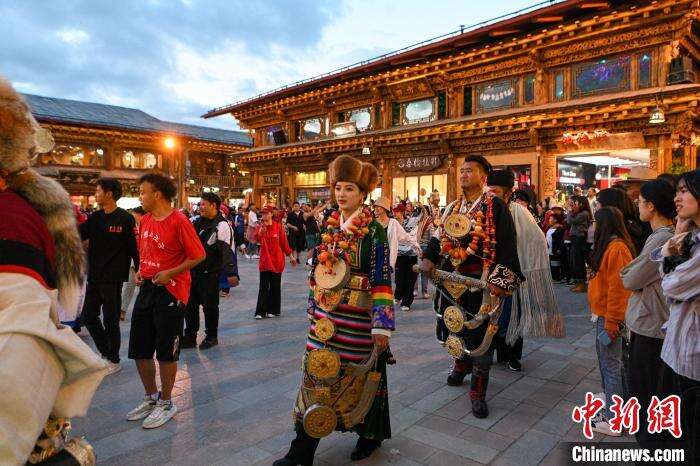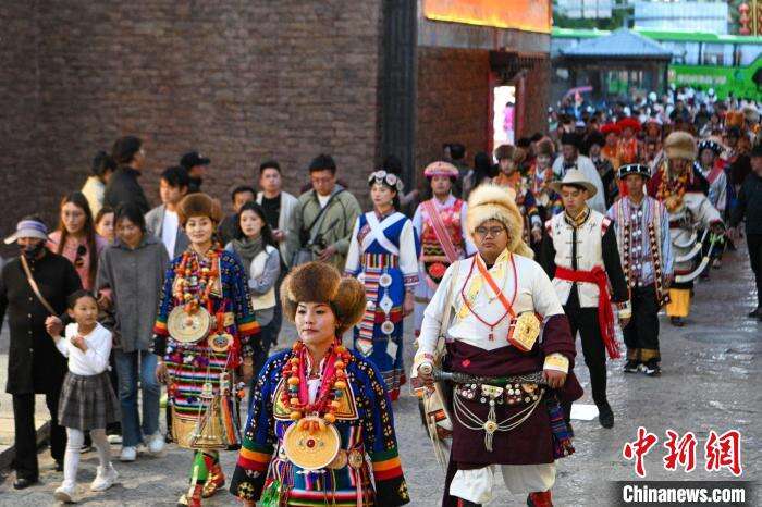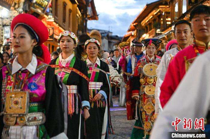 6月9日,模特在独克宗古城内巡游展示民族服饰。当日,2024年迪庆·香格里拉赛马会民族服装秀在云南省迪庆藏族自治州香格里拉市独克宗古城上演。此次服装秀借用独克宗古城为天然秀场,石板街道为 T 台,古城建筑为背景,展示民族服饰文化魅力。李嘉娴 摄