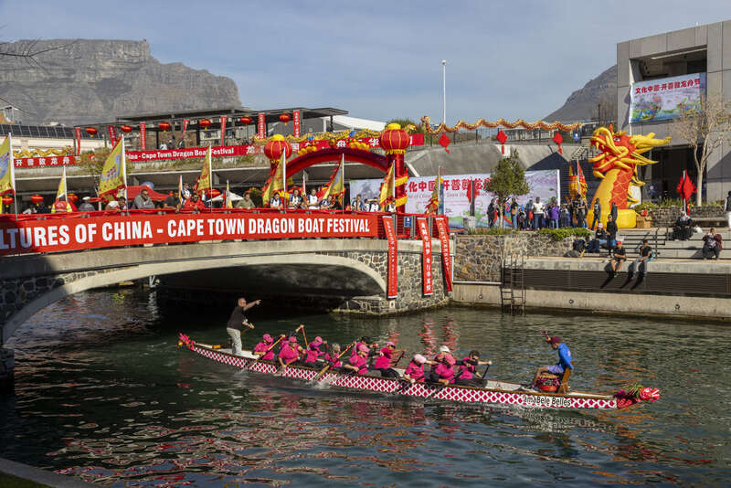 在地处南半球的南非,第二届“文化中国·开普敦龙舟节”比赛8日上午在开普敦维多利亚港的炮台公园拉开帷幕,共10支龙舟队参赛。